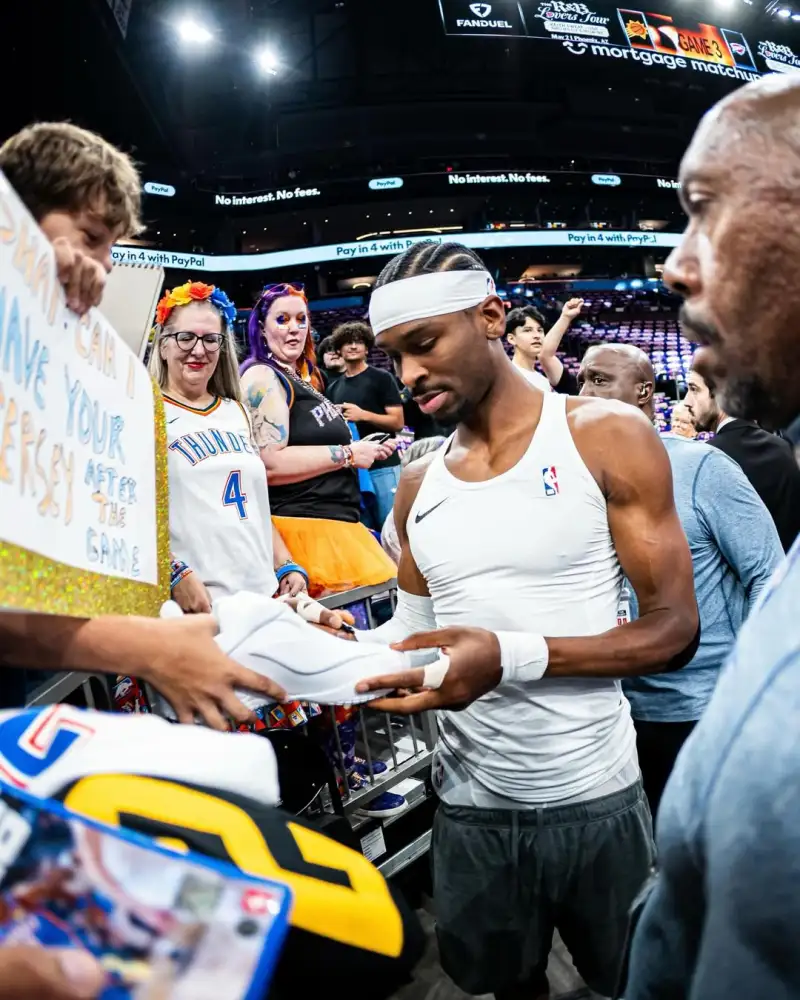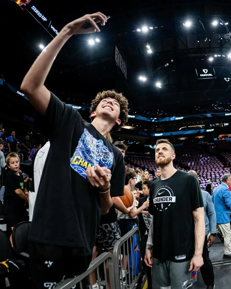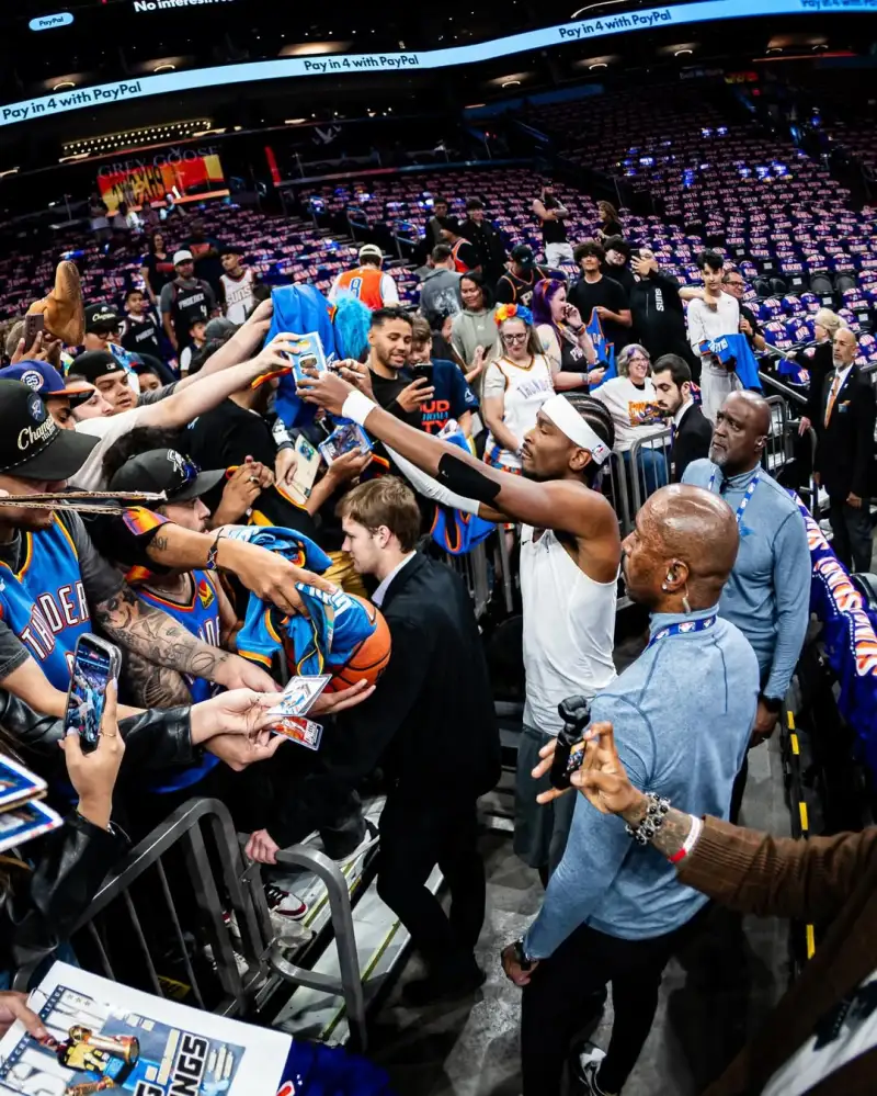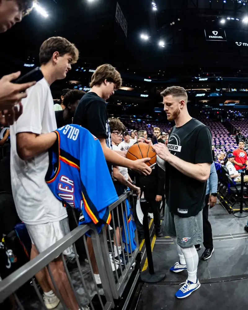 雷霆社媒晒出亚历山大、哈腾和华莱士热身结束后为客场球迷签名并合影的瞬间。